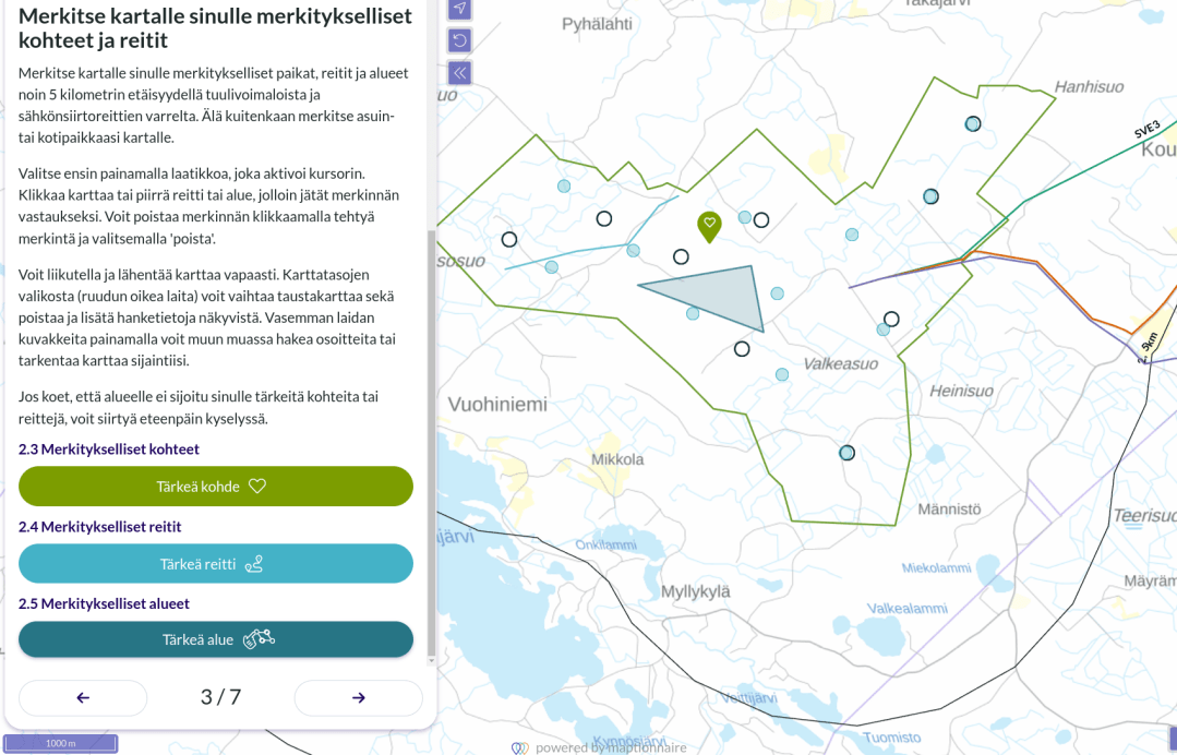 Kysely on osa hankkeen virallisia kaavoituksen ja ympäristöarvioinnin prosesseja. Se on käytännössä nettisivu, joka tarjoaa käyttäjälle monisivuisen lomakkeen ja karttasovelluksen, jonka kautta voi kyselyyn voi vastata. Lomakkeessa on monivalintoja ja avoimia kysymyksiä. Siinä on myös hieman hankalasti käytettävä vuorovaikutteinen kartta, jonka kautta voi merkitä hankealueen kohteita mm. oman käyttönsä perusteella (ulkoilu, metsästys…), tai voimalatornille sopimattomia paikkoja. Kysymykset vaikuttavat kohtalaisen neutraaleilta ja tarjoavat useita avoimia, joskin pituudeltaan rajoitettuja kenttiä vapaan tekstipalautteen antamiseen.