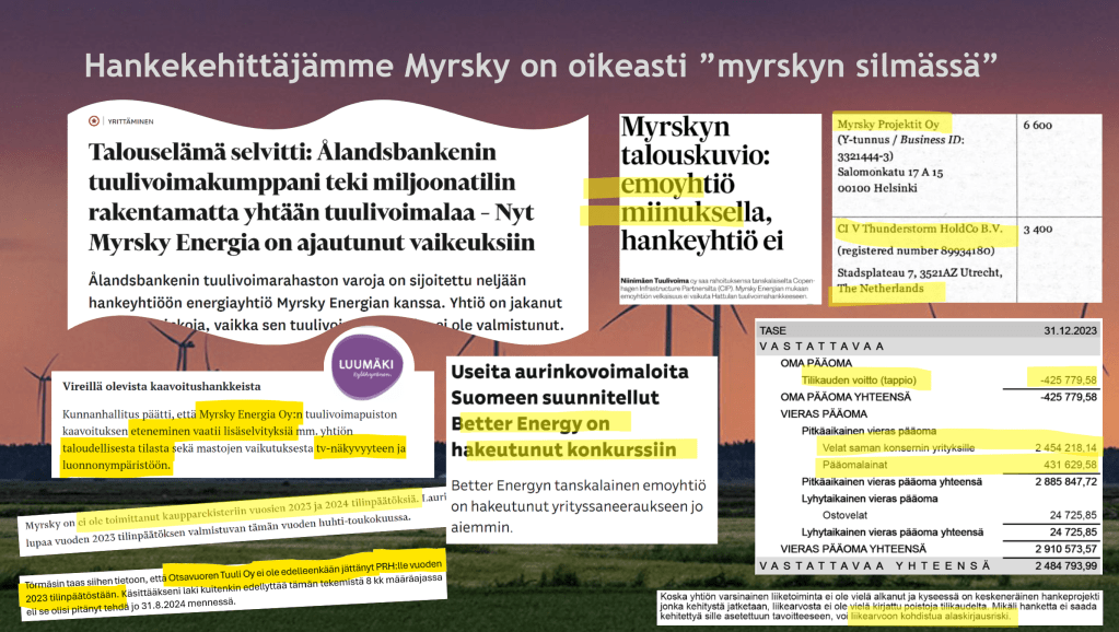 Maanomistajien neuvotteluryhmän edustaja Matti Putkiranta selviytyi kuumasta paikasta hienosti. Hän kertoi omakohtaisesti tuulivoimaan tutustumisesta, päätöksenteosta ja neuvotteluista voimalayhtiöiden kanssa korostaen ilmastonmuutoksen merkitystä ja vähätellen asian taloudellisia vaikuttimia omalta osaltaan. Hän antoi ymmärtää, että suhtautuu prosessiin neutraalisti ja odottaa selvitysten ja kunnallisdemokratian lopputuloksia ilman voimakasta intressiä suuntaan tai toiseen. Joustavaa suhtautumista kuvaa keskustelussa esiin noussut yksityiskohta: Sopimustekstin perusteella maanomistajien neuvotteluryhmä piti yhtiön myymistä ulkomaille koko ajan selvänä mahdollisuutena, eikä kuitenkaan kommentoinut Myrskyn väitettä strategiastaan olla kotimainen voimalaoperaattori ja avainlipputuote. Luotetulta neuvottelijalta ja salaisen sopimustiedon vartijalta olisi kuitenkin odottanut muille maanomistajille, kunnanhallitukselle ja kuntalaisillekin edes pientä varoituksen sanaa tasapainottamaan sokaisevia lupauksia rahasta. Onko epärehellisyys nykybisneksessä jo odotusarvo? Eikö sellainen enää estäkään solmimasta sopimuksia, etenkin sellaisia, joita ei voi irtisanoa?