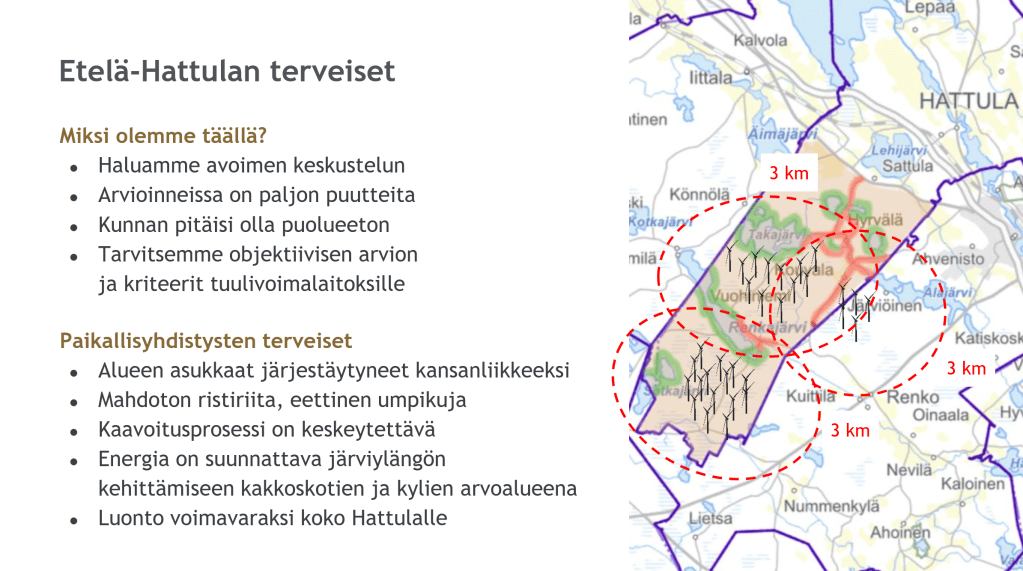 Valtteri Halla kertoi alustuksessaan Etelä-Hattulan asukasyhdistysten terveiset Härkätien kolmen voimalaitoksen kokonaisuuden varjosta