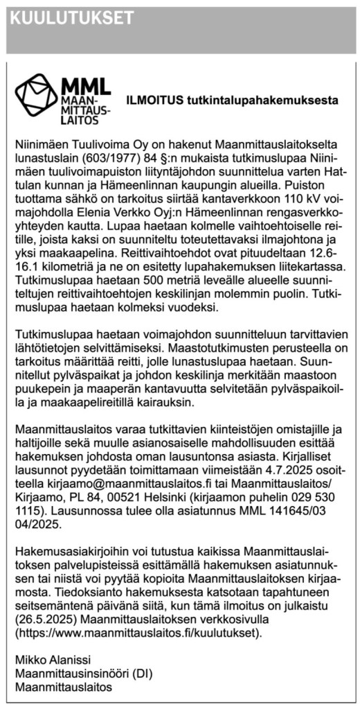 Etelä-Hattulan asukkaat yllättyivät, kun Maanmittauslaitos kuulutti, että Niinimäen Tuulivoima Oy hakee lunastuslakiin perustuen tutkimuslupaa siirtojohtojen reittien tutkimiselle. Hankekehittäjä ei ollut kertonut asiasta julkisuuteen aikaisemmin.