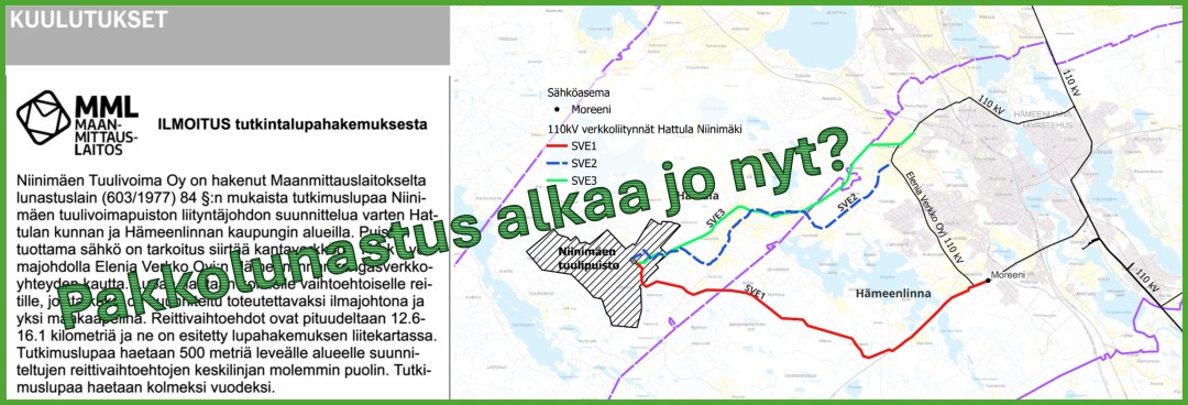 Etelä-Hattulan asukkaat yllättyivät, kun Maanmittauslaitos kuulutti, että Niinimäen Tuulivoima Oy hakee lunastuslakiin perustuen tutkimuslupaa siirtojohtojen reittien tutkimiselle. Hankekehittäjä ei ollut kertonut asiasta julkisuuteen aikaisemmin.