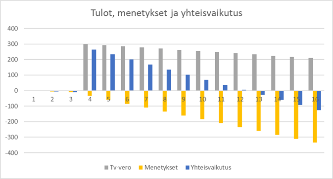 Näin laskien Hattulan kunnan tuulivoimatuotot kääntyisivät negatiiviseksi noin 10 vuodessa tuulivoimapäätöksestä alla olevan kuvan mukaisesti. Ja vielä huonommaksi yhtälö muodostuu, jos valtio tekee monien odottaman uudistuksen valtionosuuksien laskentaan.