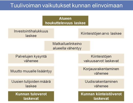 Kun palvelujen kysyntä vähenee ja voimaloita nousee naapuriin, on selvää, että muutto muualle lisääntyy. Ihmisten kuollessa talot jäävät tyhjilleen, koska uusia tulijoita ei ole. Tuloksena on näivettymisen kierre, joka ei voi olla vaikuttamatta kunnan keräämiin tuloveroihin tai kiinteistöveroihin.