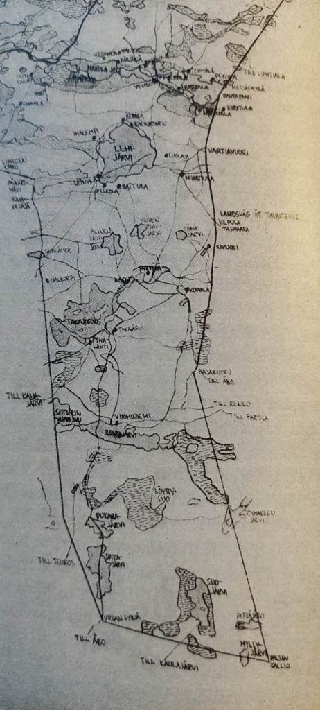 Kuva: Maantieteellinen kartta Etelä-Hattulasta vuodelta 1751. Valtionarkiston karttakokoelma, piirtänyt Juha Mäntylä. Lainaus kirjasta Hattulan historia sivu 126.