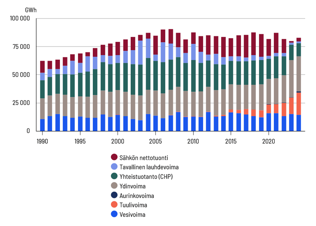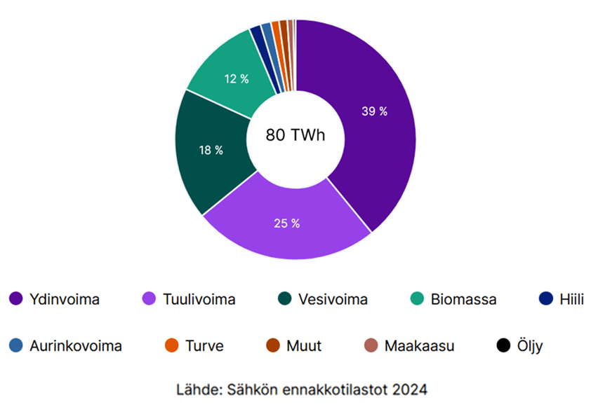 Kuva: Suomen sähköntuotannon jakautuminen tuotantomuodoittain 2024.
