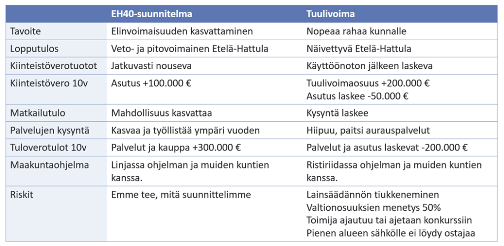 Etelä-Hattulan kehittäminen EH40-suunnitelman mukaisesti on kunnalle ja kuntalaisille huomattavasti paljon parempi vaihtoehto kuin tuulivoima. Se tuottaa enemmän, se turvaa ja kehittää elinympäristöämme, ja siihen liittyy selvästi vähemmän kalliiksi koituvia riskejä.