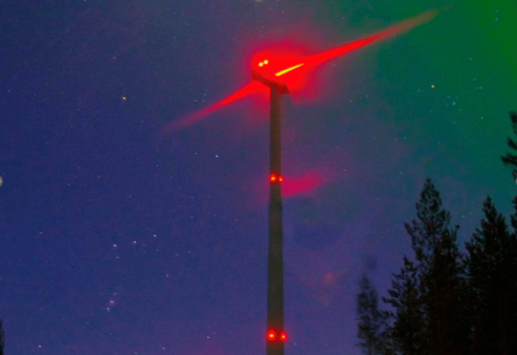 Kuva: Tuulivoimalan pakollinen lentoestovalo voi olla jatkuva punainen tai vilkkuva valkoinen. Ne näkyvät kauas ja muuttavat maaseudun valottoman maiseman kaupunkimaiseksi. Kuvan lähde: https://pelastetaansuomenluonto.fi/ajankohtaista/melu-ja-valkevaikutukset-ja-terveys/tuulivoiman-melumallinnukset-ja-saarijarven-soidinmaen-tuulivoimaloiden-meluongelmat-jarviradio-30-1-2023/