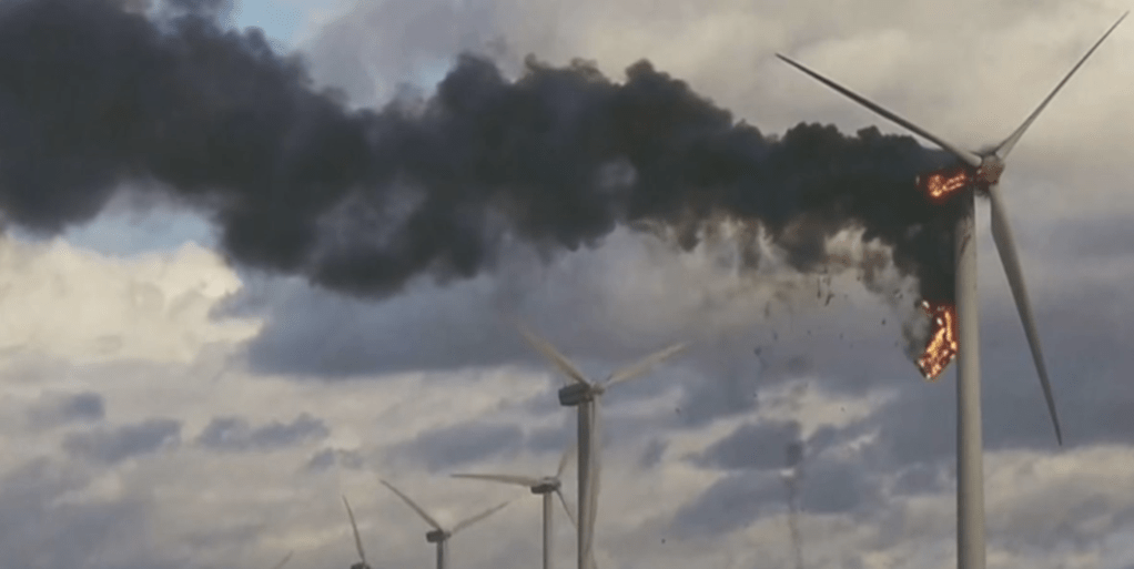 Kuva voimalapalosta, jota ei voi sammuttaa, koska kalustoa ei ole. Voimalan annetaan palaa loppuun. Kuivaan ja tuuliseen aikaan riskit hallitsemattomaan metsäpaloon ovat merkittävät.