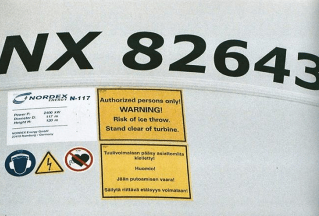Kuva: Tuulivoimaloiden ympärille on määritelty ”riittävä” varoalue. Kyltissä varoitettaneen melusta, jäänheitosta/-putoamisesta, sydämentahdistimen käytöstä ja ukonilmasta tai sähköiskun vaarasta.