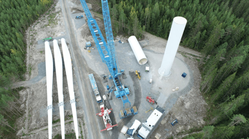 Kuva: Yhden tuulivoimalarakennuksen vaatima alue on 2–3 hehtaaria. Se on murto-osa tuulivoimalan tarvitsemasta kokonaismaapinta-alasta. Kuvan lähde: https://www.epvtuulivoima.fi/uutiset/vakava-tyotapaturma-epv-tuulivoiman-rakenteilla-olevan-norrskogenin-tuulivoimapuiston-tyomaalla-yksi-henkilo-on-loukkaantunut-vakavasti/