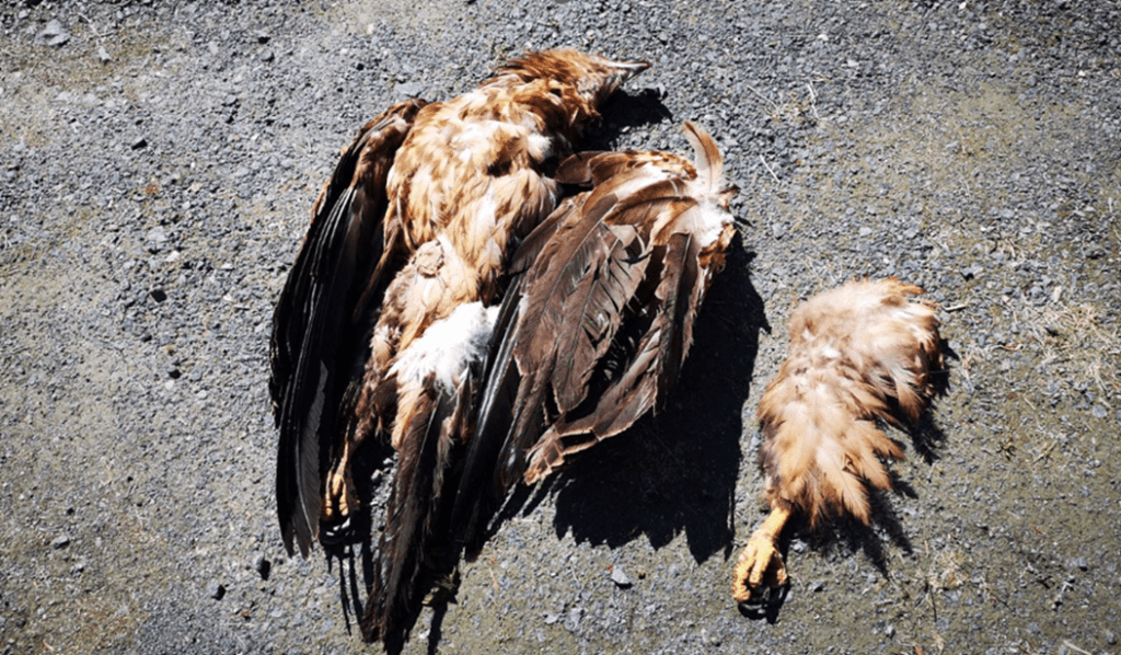 Kuva: Tuulivoimalan uhreista yksi.  Tutkimuksen mukaan 75 % petolinnuista häviää tuulivoimaloiden alueilta. Kuvan lähde: https://www.kaleva.fi/kahtia-repeytynyt-merikotka-loytyi-ajoksesta-tutki/5588929
